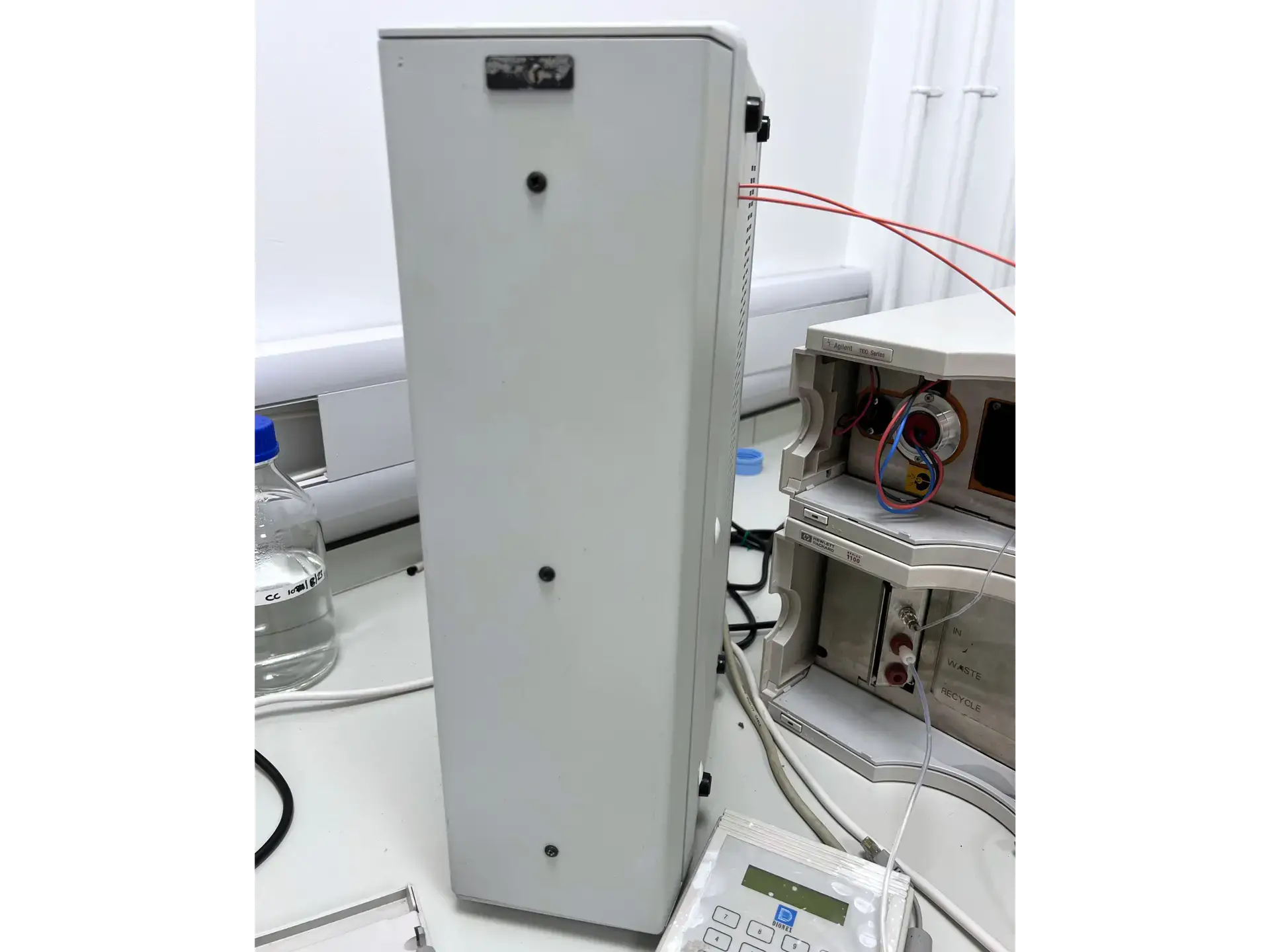 This HPLC configuration includes a HP 1100 Degasser (G1322A), which comprises of a 4-channel vacuum container. As well as a HP 1100 ALS (G1313A), with a 100 position sample tray and and an injection range of 1 to 100 ul. An Agilent 1100 Bin Pump (G1312A), designed for pulse-free solvent delivery and efficient mixing. A 1100 ColCom (G1316A), which can hold up to three 30 cm columns and offers precise temperature control, for peltier heating and cooling. A HP 1100 RID (G1316A), to measure the refractive index of a solution as it flows through the detector. And a HP 1100 DAD (G1315B) for scanning samples with a range of UV and visible light wavelengths. Additionally, this system comes with a Dionex STH585 Column oven, complete with controller.