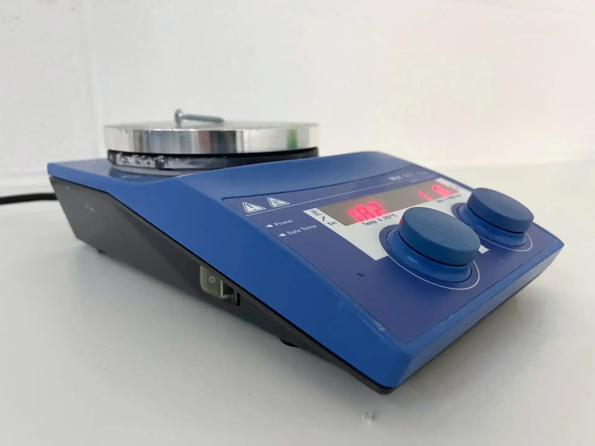 This model features a temperature range from ambient to 310 °C, supporting a wide variety of heating applications. Its stirring function provides a speed range of 0 to 1200 rpm, making it suitable for everything from gentle mixing to high-speed agitation. The hotplate’s circular plate has a diameter of 13.5cm, making it compatible with standard laboratory glassware and ensures stability during use. A bright digital display shows temperature and speed, and both are controlled by two simple dials.