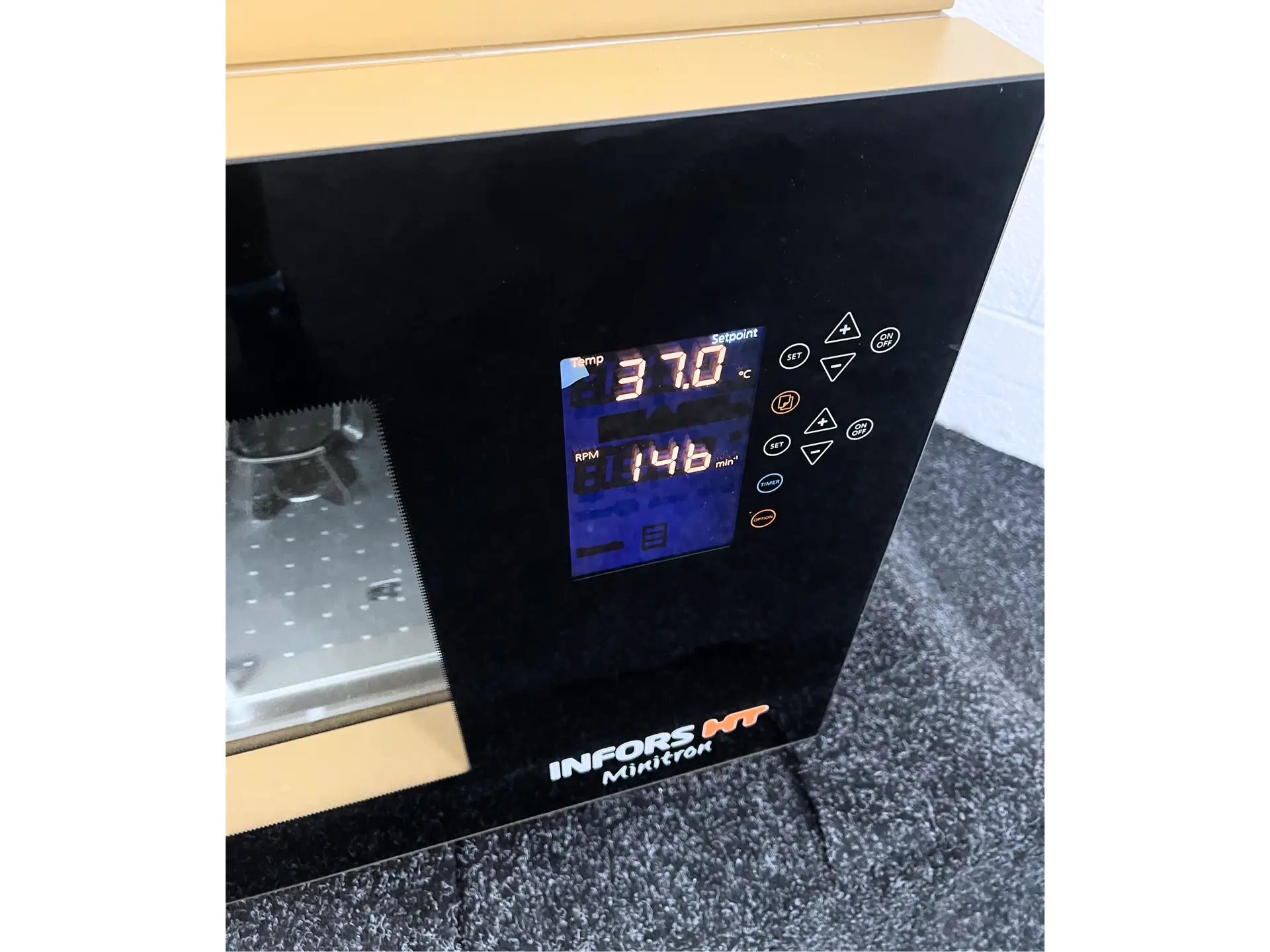 Features of the Minitron include a temperature range of between 5°C – 65°C, which can be changed in 0.1°C increments. Speeds of 20 – 400 rpm can be achieved dependent on the type of vessel used and the holder. Furthermore, a touch screen panel provides user friendly control, and the quick start guide lets you quickly and easily set up your parameters. Internally, the Minitron measures 52 x 57 x 54 cm and has a stainless steel finish, as well as 3 x stainless steel clamps. Externally, the Minitron measures 80 x 62.5 x 70 cm and has a black and gold finish.