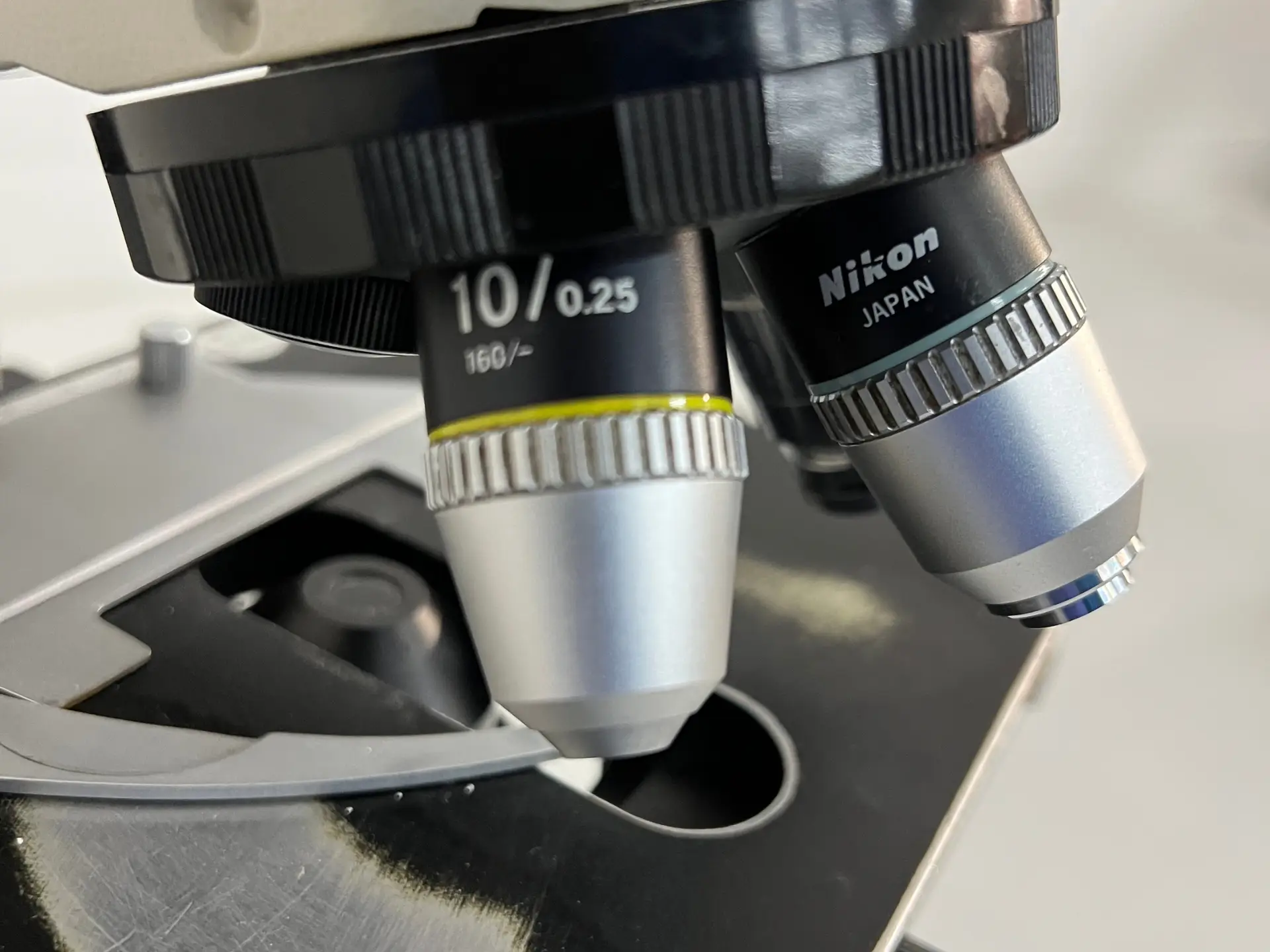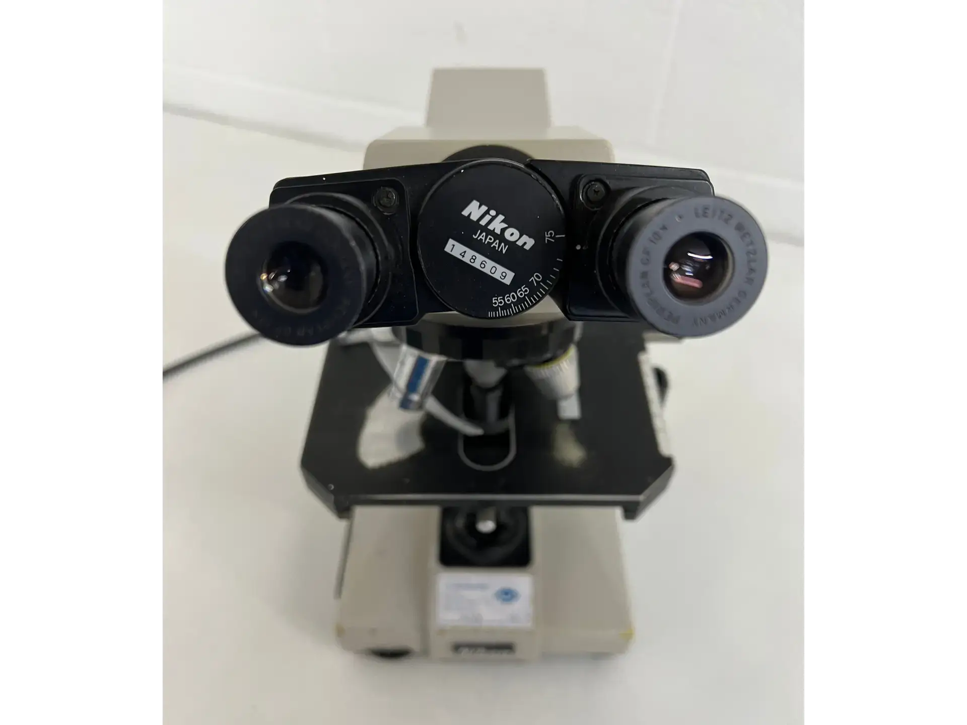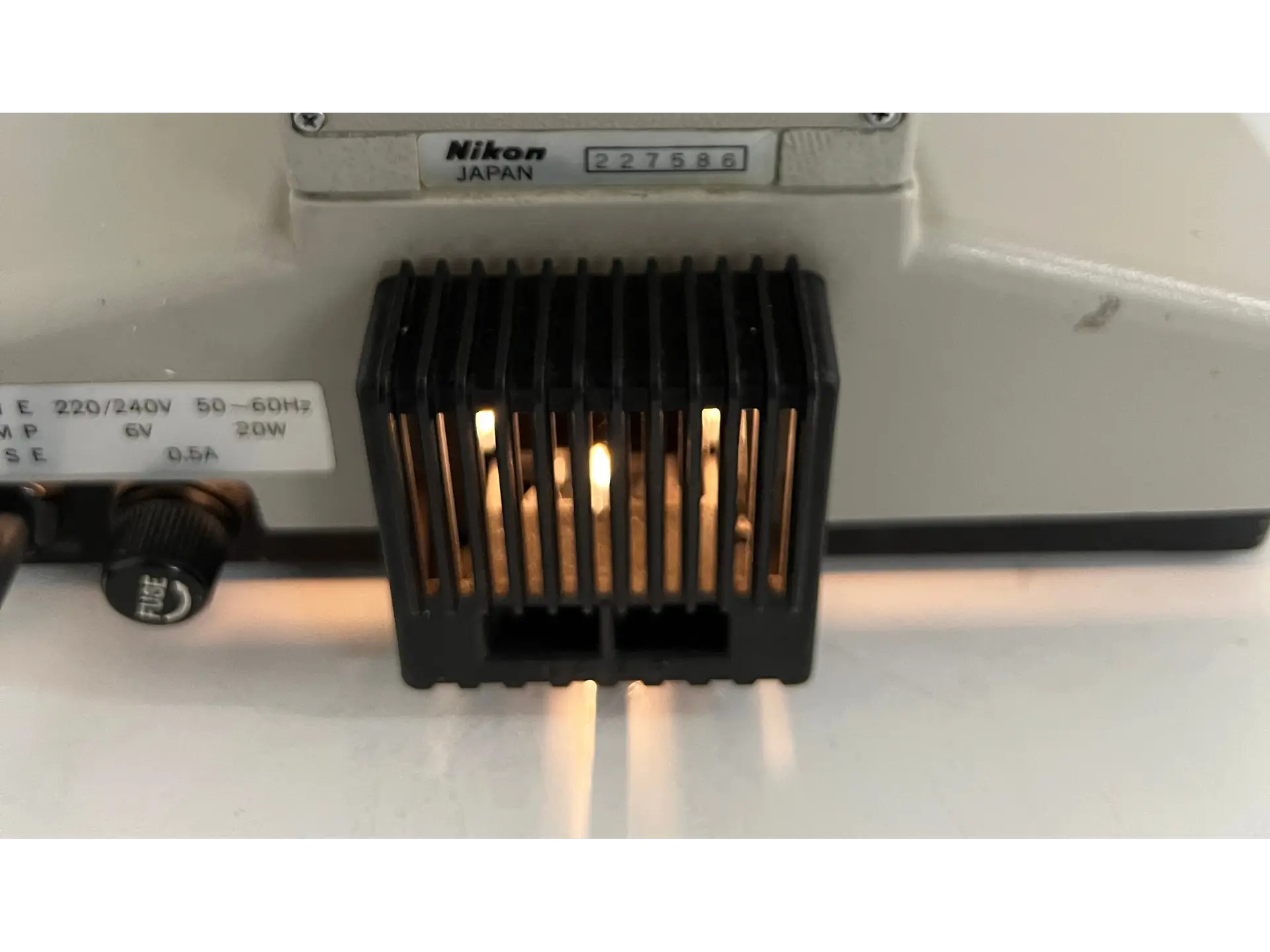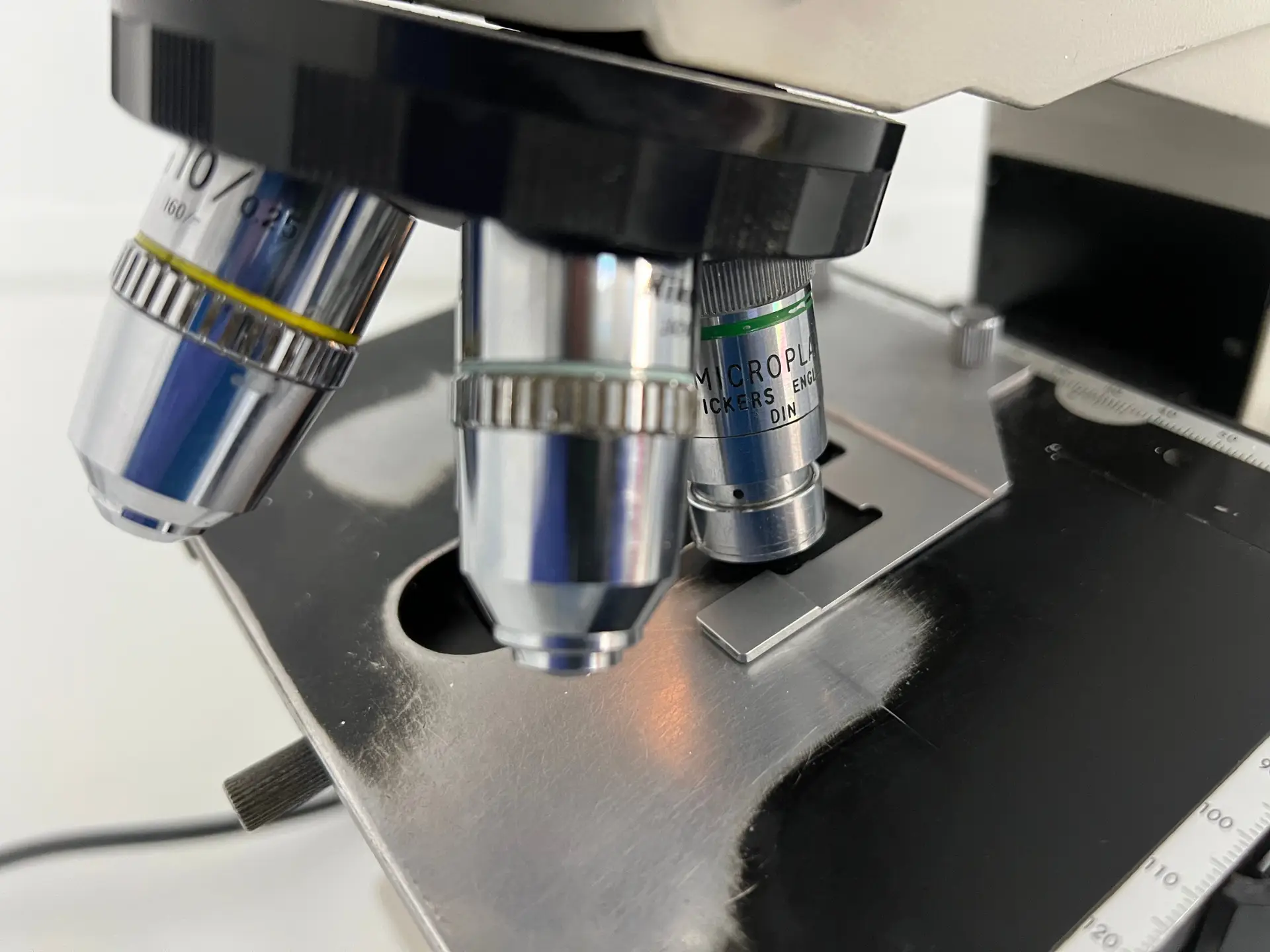 The Nikon Labophot Microscope is a robust, high-precision optical instrument engineered for both routine and advanced laboratory work. Its upright design and binocular viewing head ensure a comfortable and immersive viewing experience, ideal for extended observation sessions. Equipped with a comprehensive range of objectives, the microscope supports detailed visualisation at multiple magnifications. Included are Plan 10/0.25 (yellow), Plan 40/0.65 (blue), Microplan 100/1.25 OIL (white), and Microplan 25/0.5 (green)* objectives. These lenses offer excellent resolution and contrast, with the oil immersion objective (100x) providing particularly fine detail for high-powered analysis.