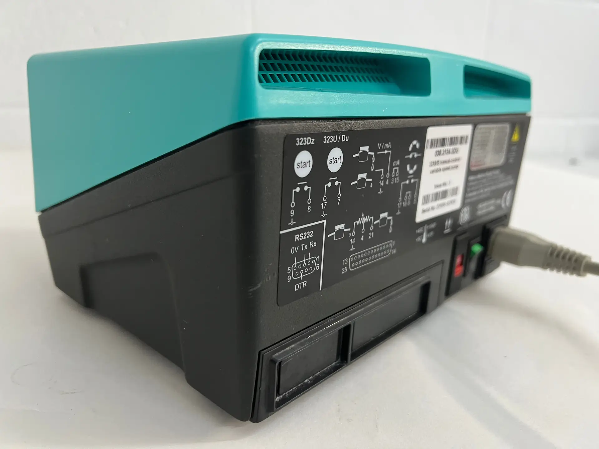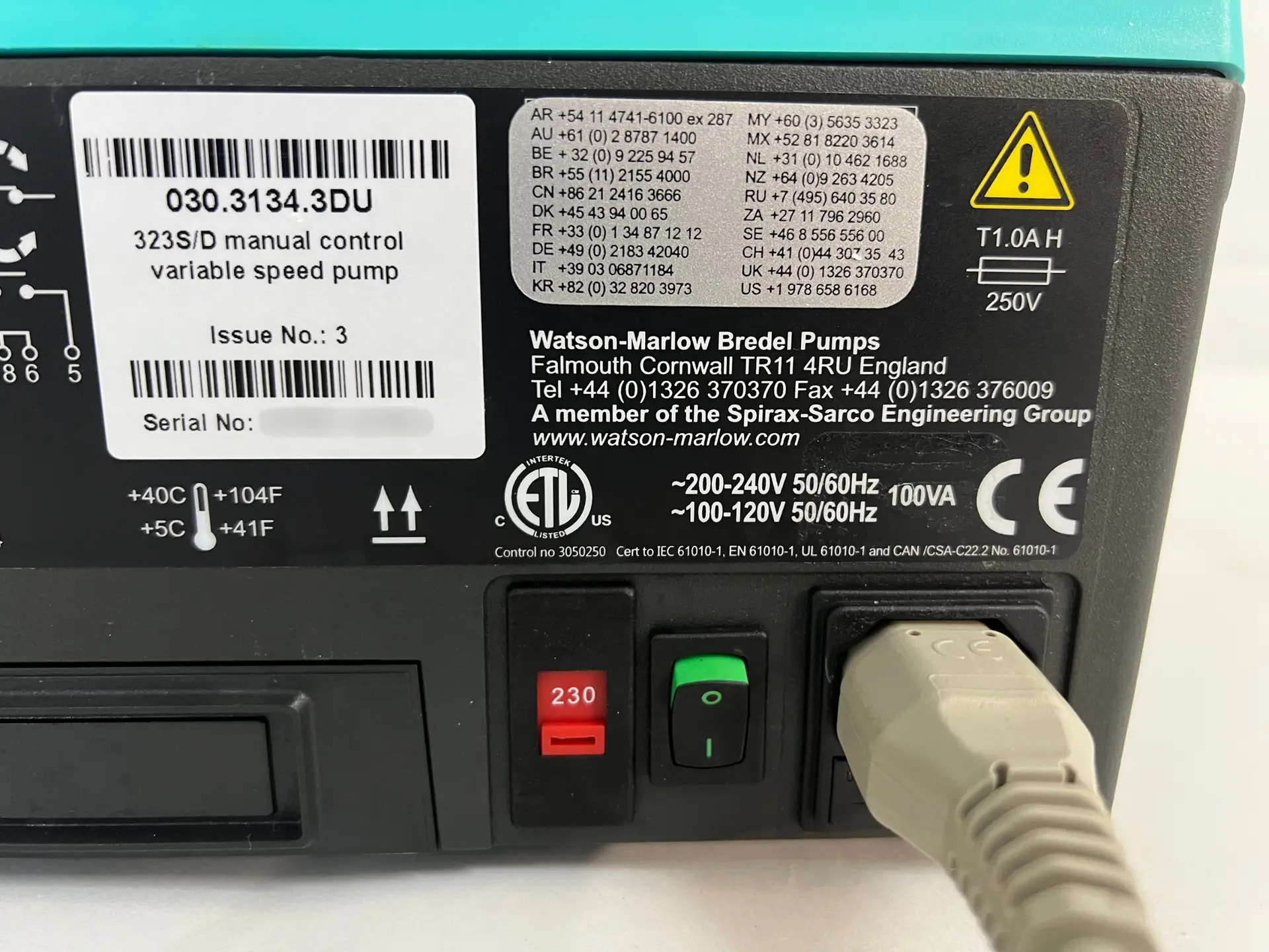 The Watson-Marlow 323 Series Drive features variable speed control, allowing precise adjustments to suit different applications. It operates within a motor speed range of 3.0 to 400 rpm, ensuring flexibility in performance. The enclosure has an IP31 rating, providing protection against solid objects and limited moisture exposure. Users can control the pump manually or remotely using 4-20mA or 0-10V analogue auto-control, as well as RS232 control commands. The pump head incorporates a 3-roller design, ensuring smooth and efficient operation.